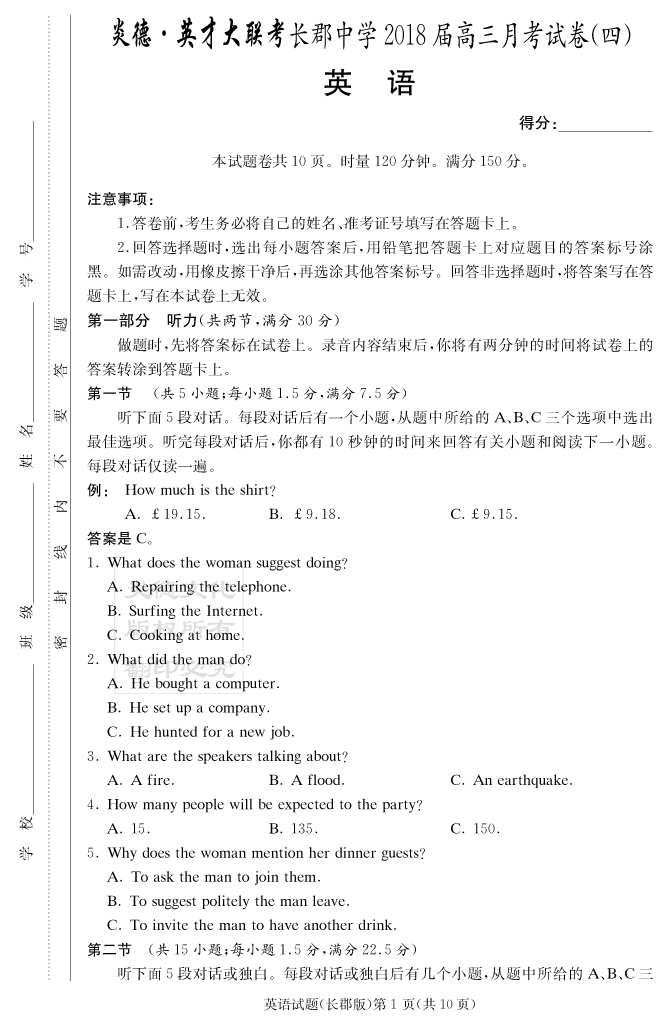 【英語】炎德英才大聯(lián)考2018長郡中學(xué)高三4次月考
