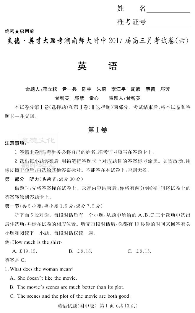 【英語】炎德英才大聯(lián)考2017師大附中高三6次月考