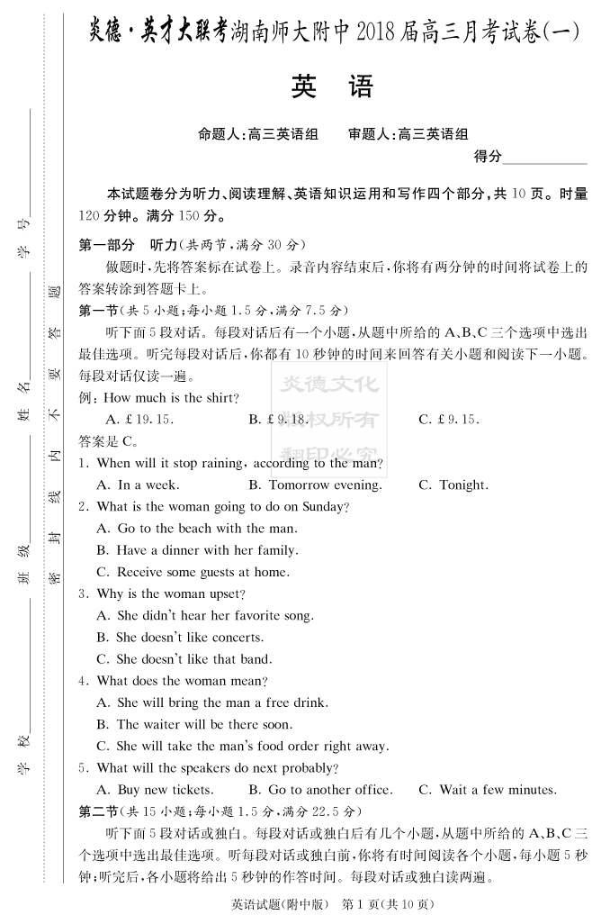 【英語】炎德英才大聯考2018師大附中高三1次月考