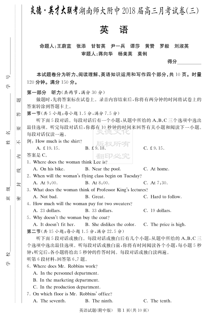 【英語】炎德英才大聯(lián)考2018師大附中高三3次月考