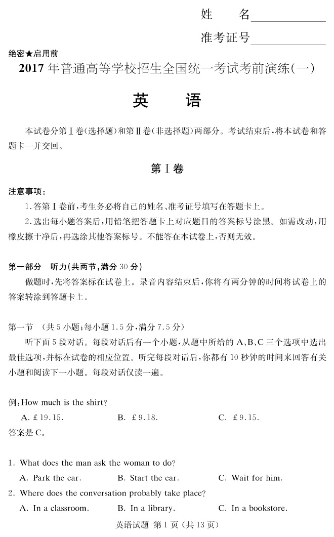 【英語】2017年普通高等學校招生全國統一考試考前演練(一)