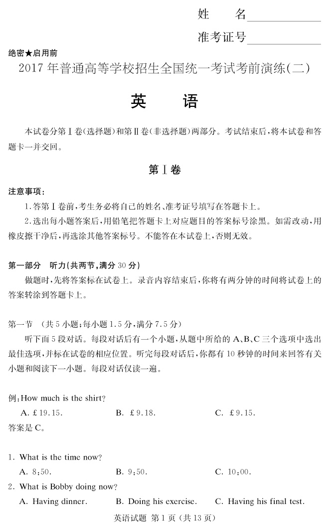 【英語(yǔ)】2017年普通高等學(xué)校招生全國(guó)統(tǒng)一考試考前演練(二)