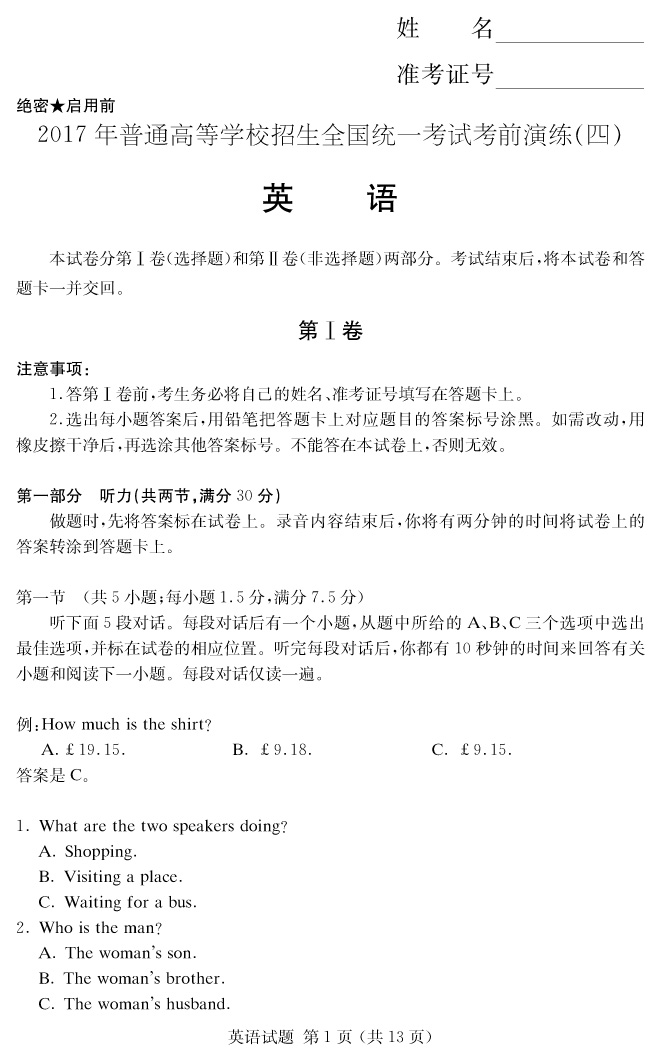 【英語】2017年普通高等學(xué)校招生全國統(tǒng)一考試考前演練(四)