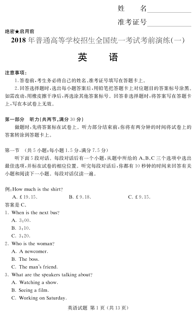 【英語(yǔ)】2018年普通高等學(xué)校招生全國(guó)統(tǒng)一考試考前演練(一)