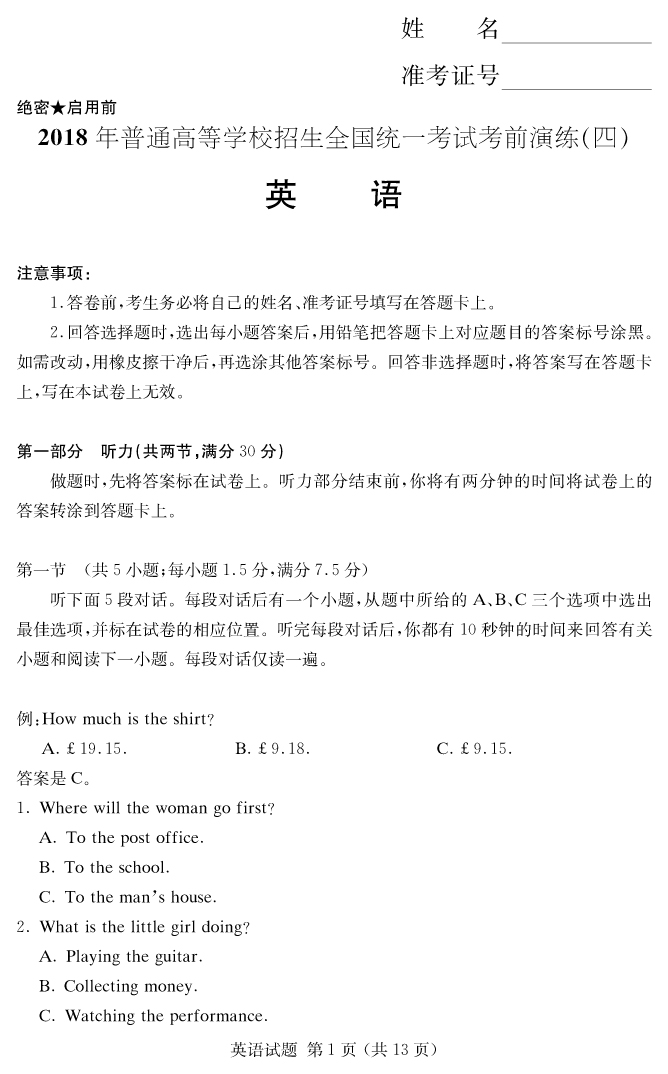 【英語】2018年普通高等學校招生全國統一考試考前演練(四)