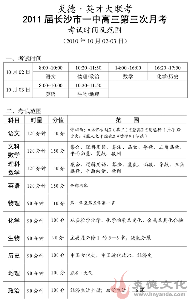 炎德英才大聯考長沙市一中2011屆高三第三次月考考試時間和范圍