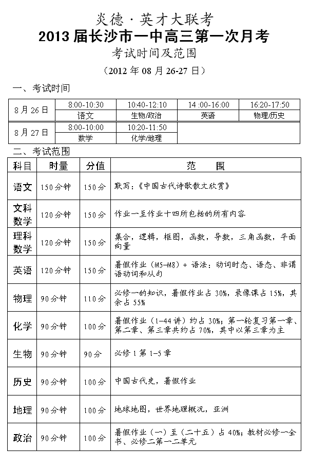 炎德英才大聯(lián)考長沙市一中2013屆高三第一次月考考試時間和范圍