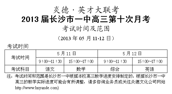 炎德英才大聯考長沙市一中2013屆高三第十次月考考試時間