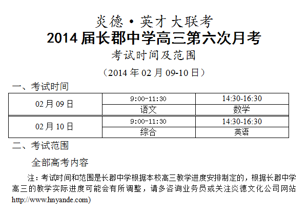 炎德英才大聯(lián)考長郡中學(xué)2014屆高三第6次月考考試時間和范圍(2014.02.09-10)