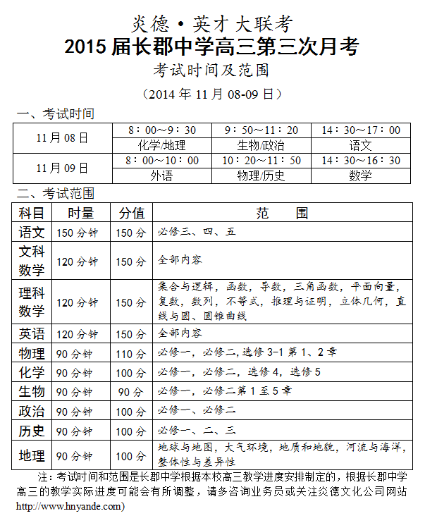 炎德英才大聯考長郡中學2015屆高三第3次月考考試時間和范圍(2014.11.08-09)