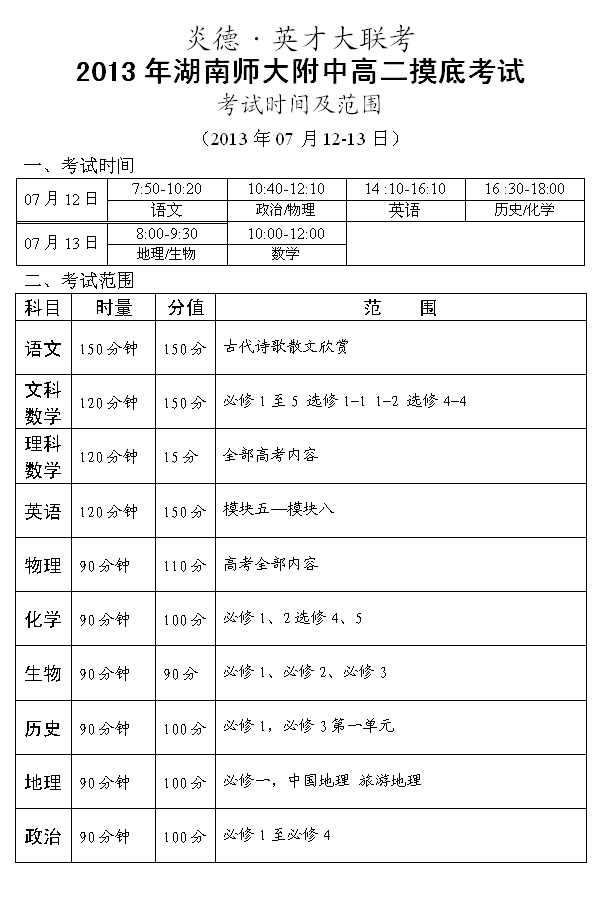 炎德英才大聯考師大附中2013年高二摸底考試時間和范圍(2013.07.12-13)