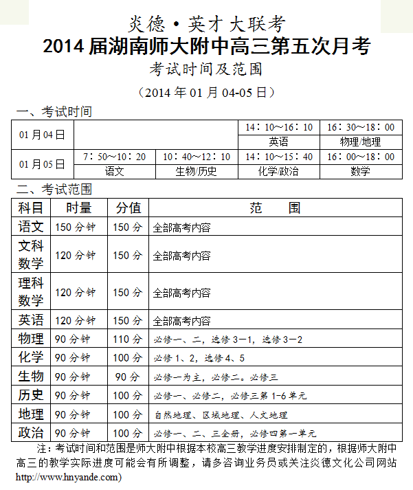 炎德英才大聯考師大附中2014屆高三第5次月考考試時間和范圍(2013.01.04-05)