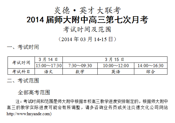 炎德英才大聯考師大附中2014屆高三第7次月考考試時間和范圍(2014.03.14-15)