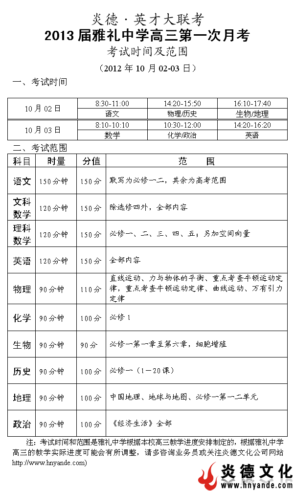 炎德英才大聯考雅禮中學2013屆高三第一次月考考試時間和范圍