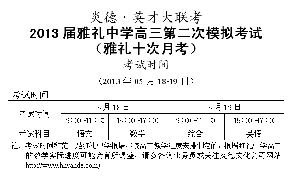 炎德英才大聯(lián)考雅禮中學(xué)2013屆高三第十次月考考試時(shí)間和范圍