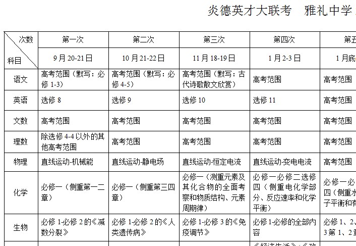 炎德英才大聯考雅禮中學2014屆高三月考試卷考試時間和范圍(第1-10次)