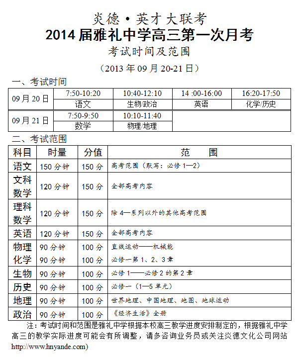 炎德英才大聯考雅禮中學2014屆高三第1次月考考試時間和范圍(2013.09.20-21)