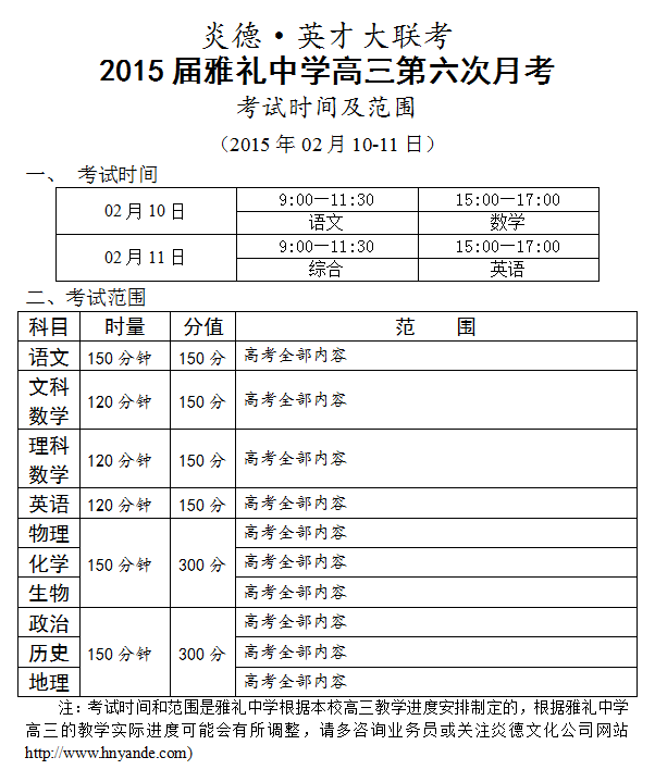 炎德英才大聯考雅禮中學2015屆高三第6次月考考試時間和范圍(2015.02.10-11)