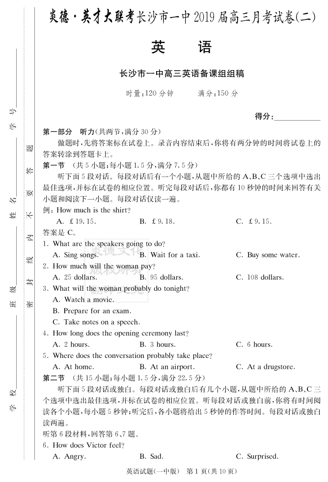 【英語】炎德英才大聯考2019長沙一中高三2次月考