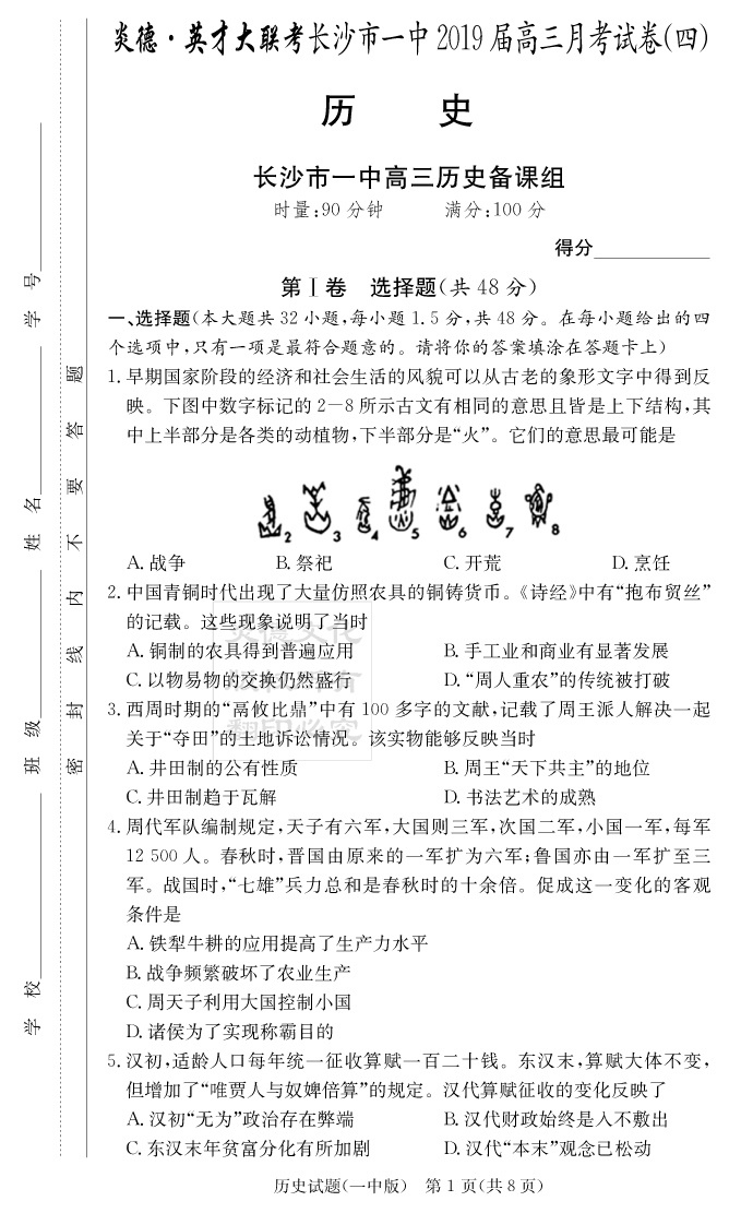 【歷史】炎德英才大聯(lián)考2019長(zhǎng)沙一中高三4次月考