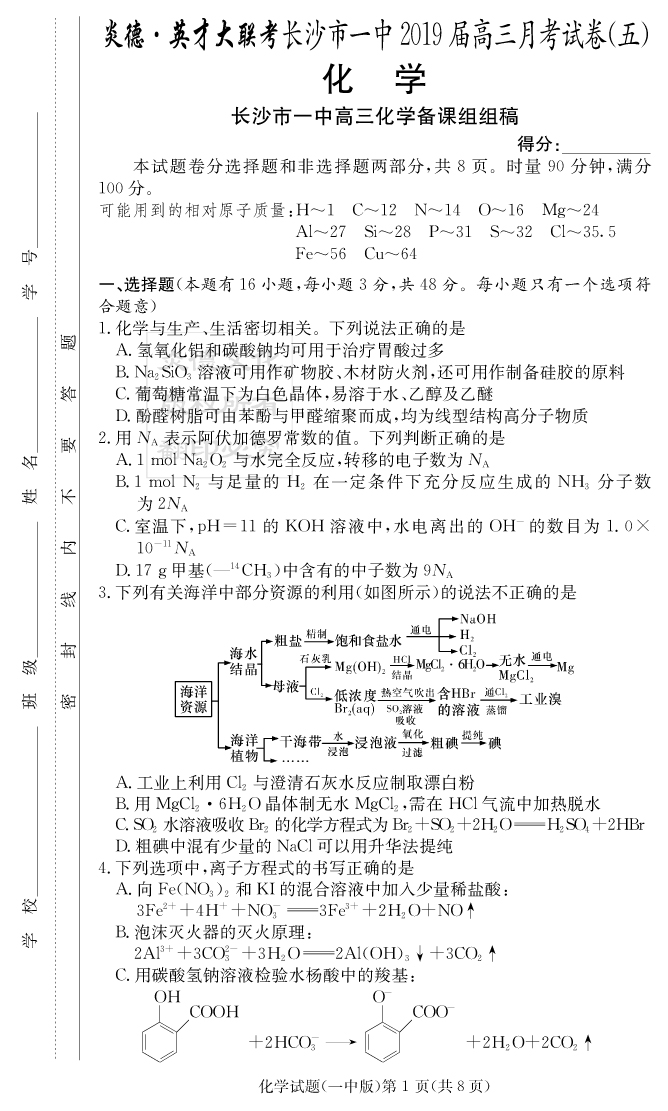 【化學】炎德英才大聯考2019長沙一中高三5次月考