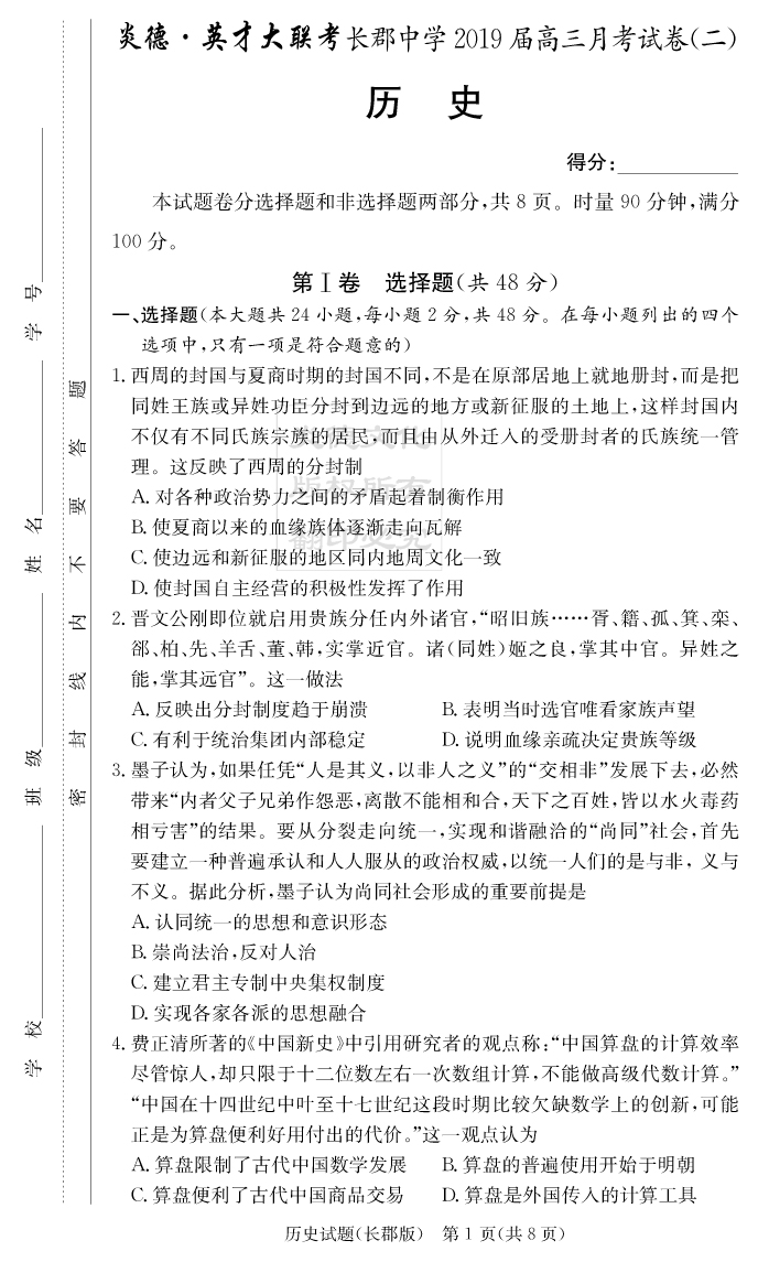 【歷史】炎德英才大聯考2019長郡中學高三2次月考