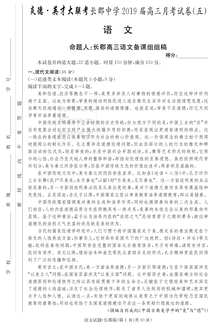 【語(yǔ)文】炎德英才大聯(lián)考2019長(zhǎng)郡中學(xué)高三5次月考
