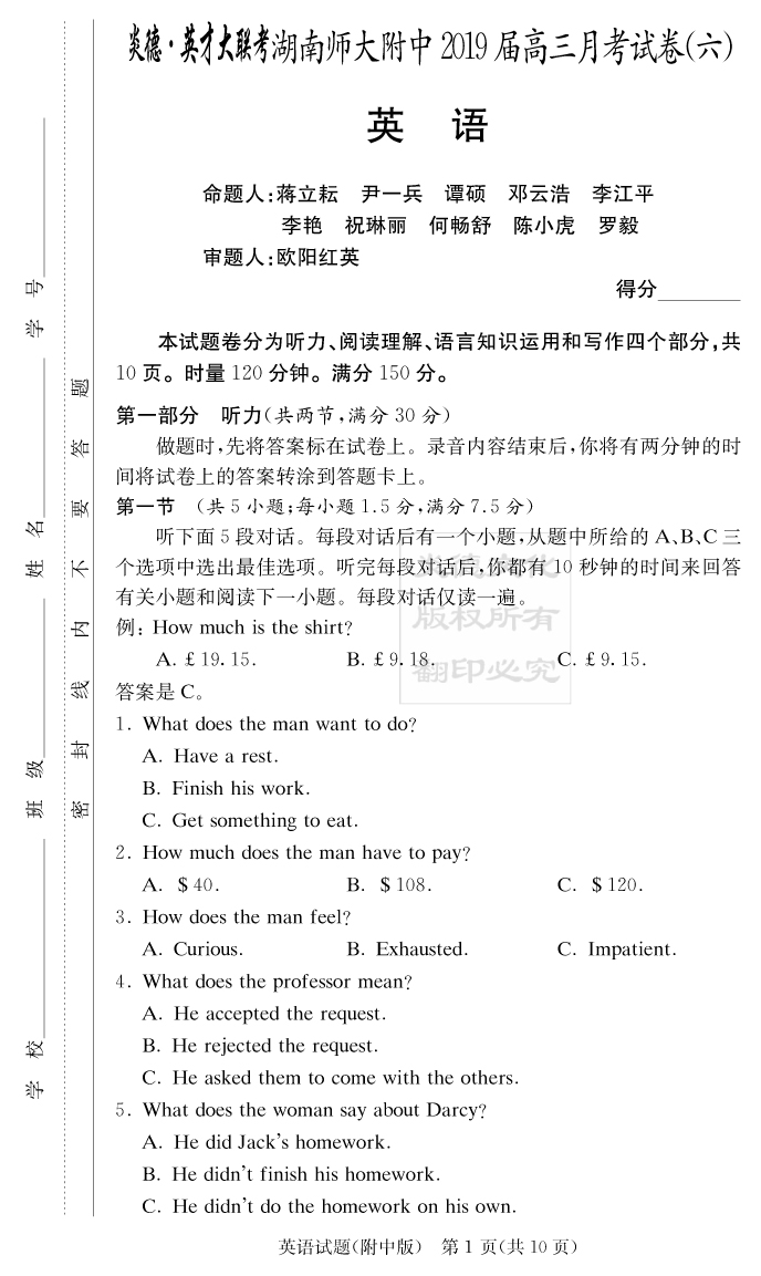 【英語】炎德英才大聯考2019師大附中高三6次月考
