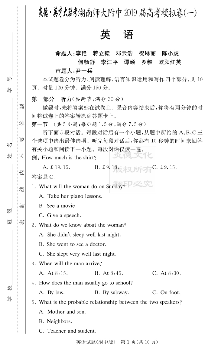 【英語】炎德英才大聯考2019師大附中高三8次月考(模擬一)