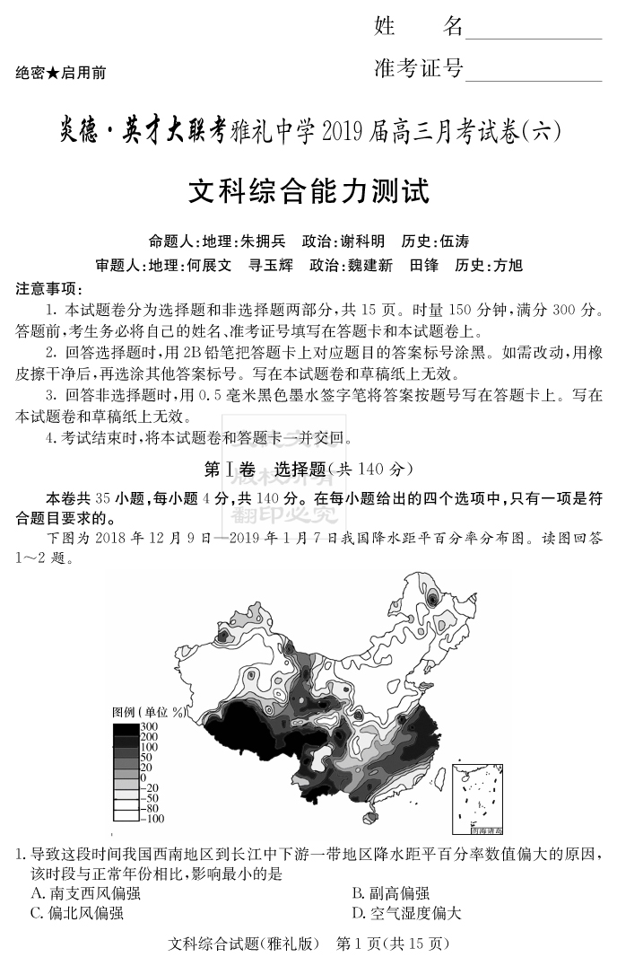 【文綜】炎德英才大聯考2019雅禮中學高三6次月考