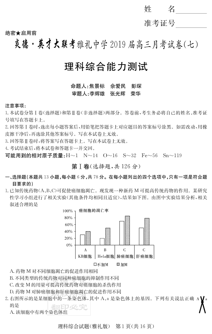 【理綜】炎德英才大聯考2019雅禮中學高三7次月考