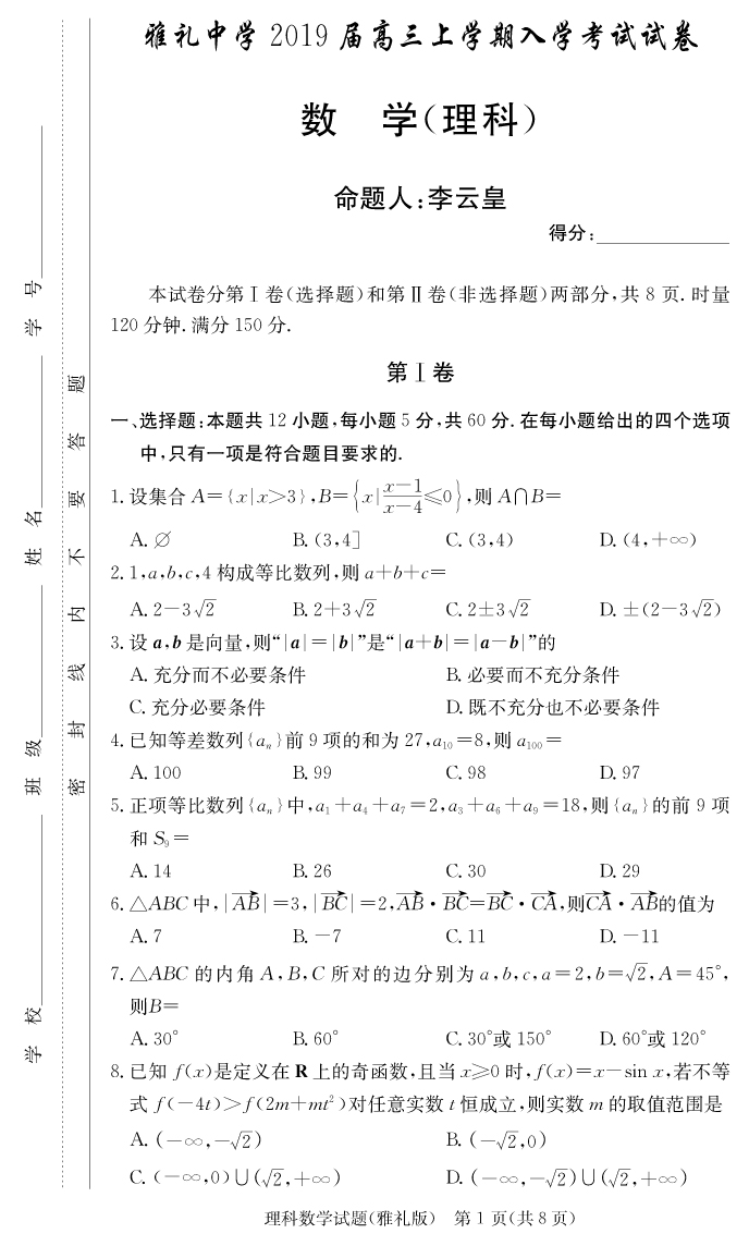 【理數(shù)】雅禮中學(xué)2019屆高三上學(xué)期入學(xué)考試