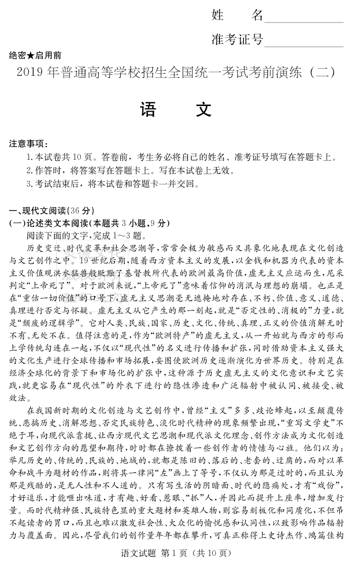 【語文】2019年普通高等學校招生全國統一考試考前演練(二)
