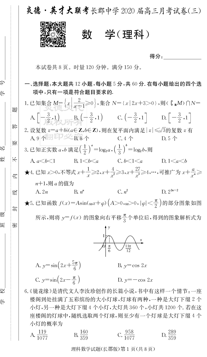 【理數(shù)】炎德英才大聯(lián)考2020屆長(zhǎng)郡中學(xué)高三3次月考