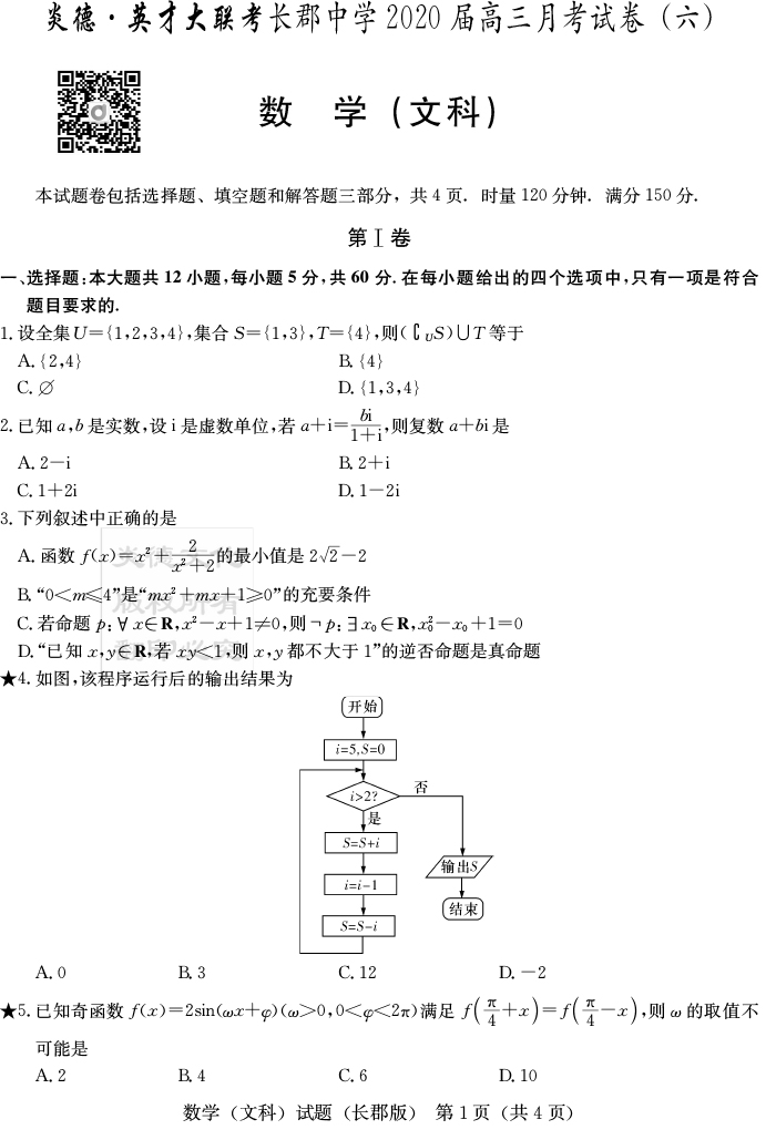 【文數】炎德英才大聯考2020屆長郡中學高三6次月考