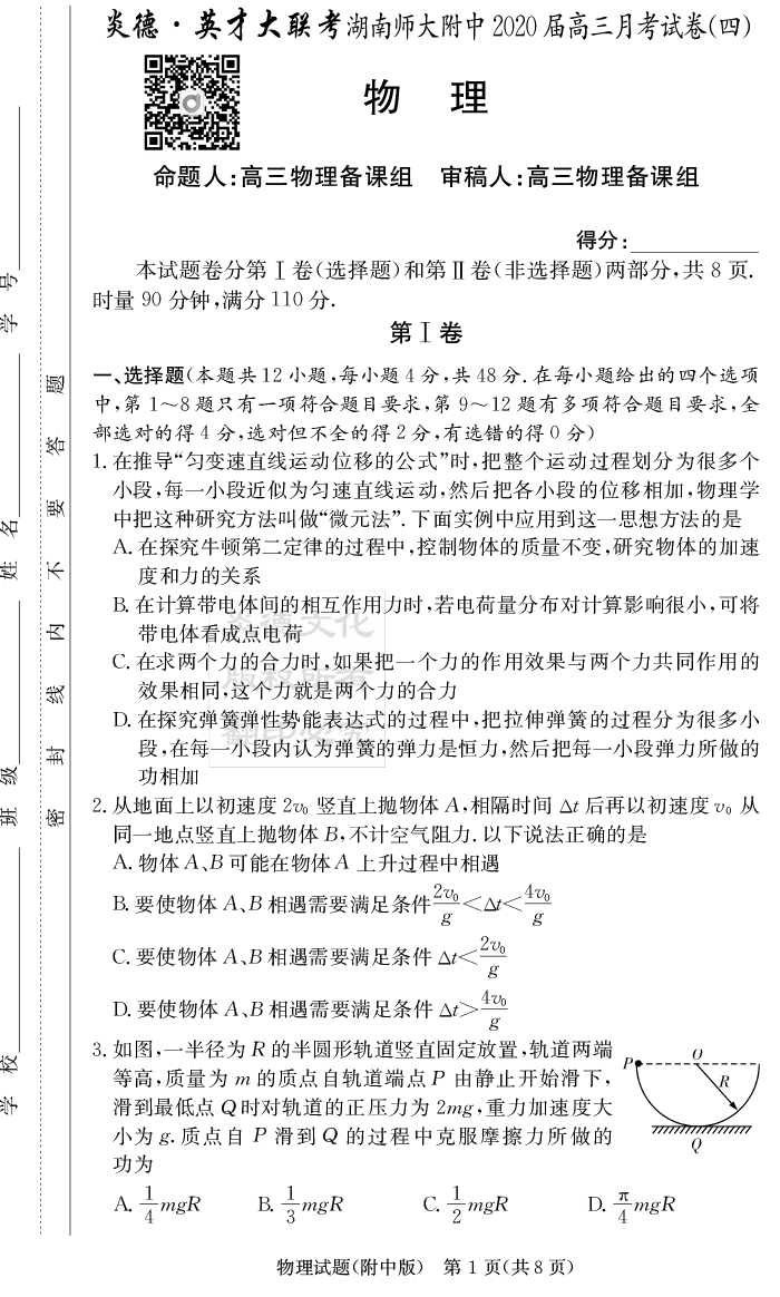 【物理】炎德英才大聯考2020屆師大附中高三4次月考