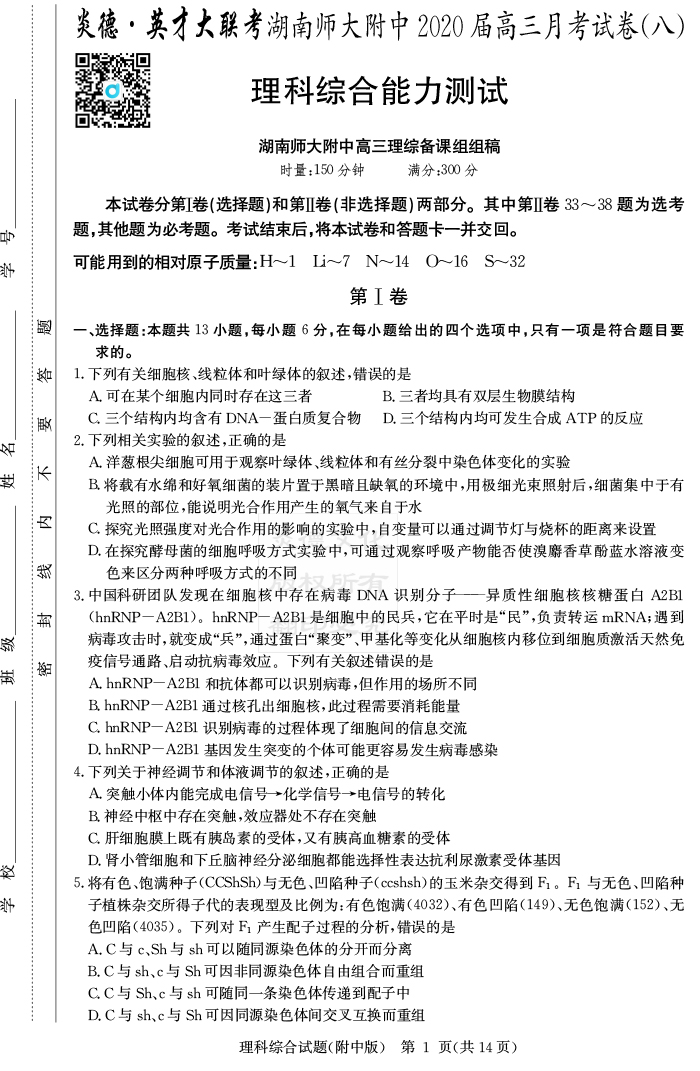 【理綜】炎德英才大聯(lián)考2020屆師大附中高三8次月考