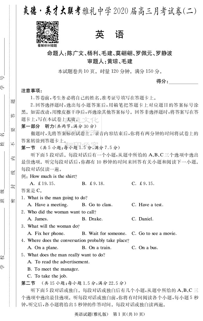 【英語(yǔ)】炎德英才大聯(lián)考2020屆雅禮中學(xué)高三2次月考