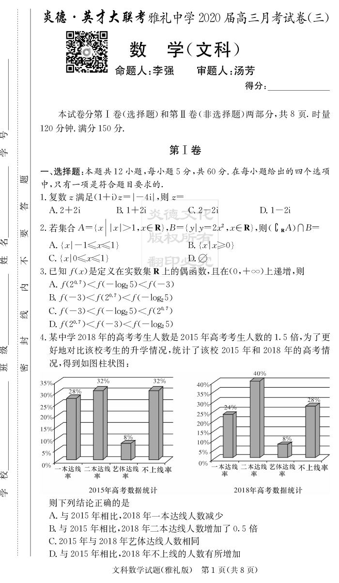 【文數】炎德英才大聯考2020屆雅禮中學高三3次月考