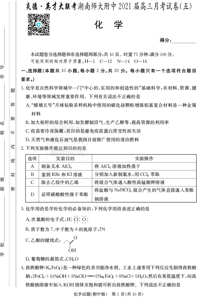2026長郡中學新高考考前小題沖刺訓練·化學