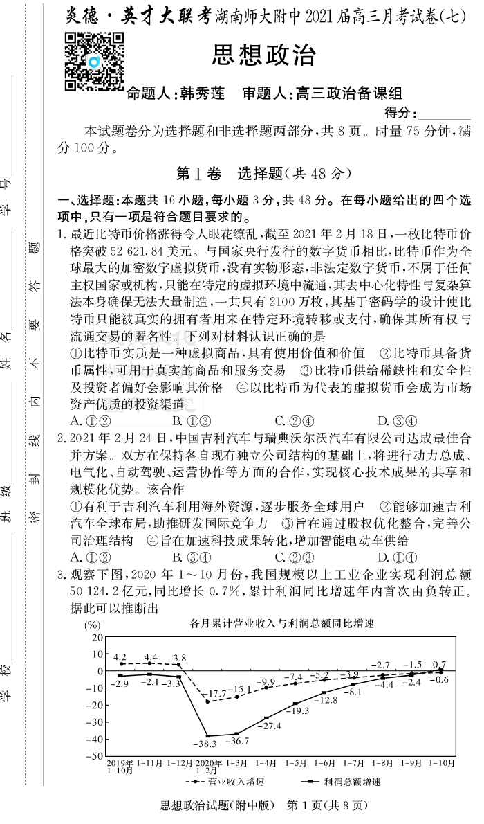 【政治】炎德英才大聯考2021屆湖南師大附中高三7次月考