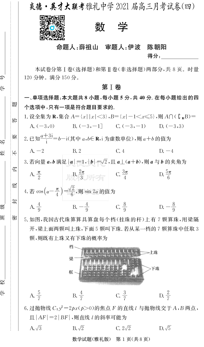 【數(shù)學(xué)】炎德英才大聯(lián)考2021屆雅禮中學(xué)高三4次月考