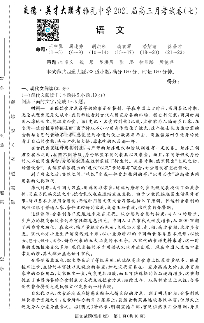 【語文】炎德英才大聯考2021屆雅禮中學高三7次月考