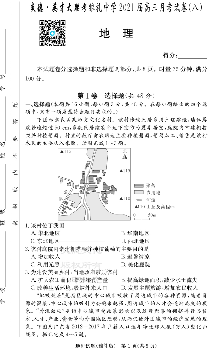 【地理】炎德英才大聯考2021屆雅禮中學高三8次月考