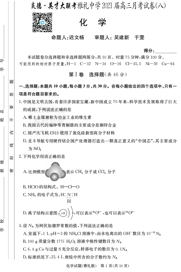 【化學】炎德英才大聯考2021屆雅禮中學高三8次月考