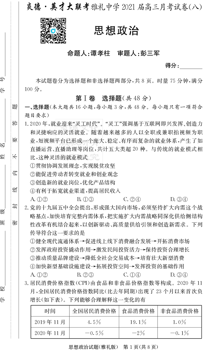 【政治】炎德英才大聯考2021屆雅禮中學高三8次月考