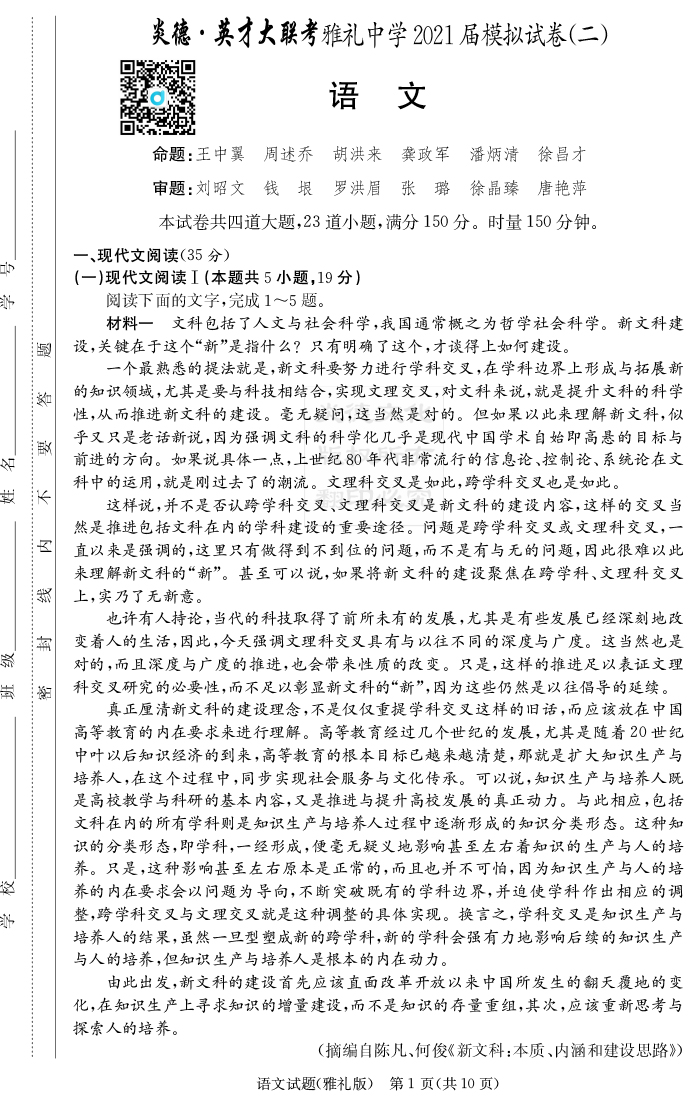【語文】炎德英才大聯考2021屆雅禮中學高三10次月考(模擬二)
