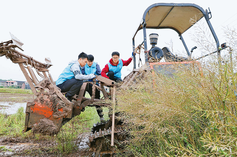 圖為2023年4月29日,南華大學的大學生志愿者利用五一假期到湖南省衡陽市衡陽縣西渡鎮新橋村開展勞動助農行動,幫助農民檢修、保養農機,用勞動實踐助力鄉村振興。(新華社發 曹正平/攝)
